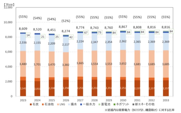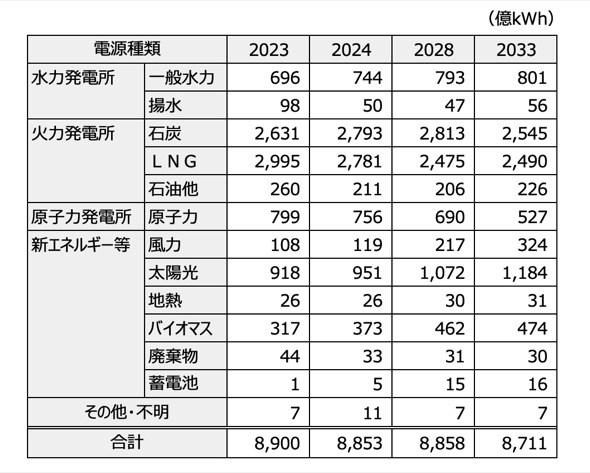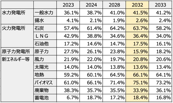 比較のため、表7では「2023年度供給計画取りまとめ」から、10年後(2032年度)の数値を加えたところ、2033年度には多くの電源種で設備利用率の下方修正が行われていることが分かった。「供給計画取りまとめ」ではこの理由は説明されていないが、再エネ電源の増加による出力制御の増加が一因であると推察される。