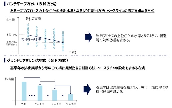 また、排出枠の割当方法やベースラインの設定方法には、上位グループの排出水準達成を求める「ベンチマーク方式(BM方式)」と、過去の排出実績等からの一定比率の改善を求める「グランドファザリング方式(GF方式)」が存在し、EU-ETSはBM方式、K-ETSは両者を併用している。