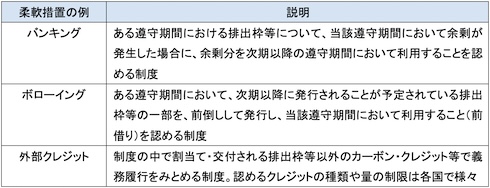 時間軸での柔軟性を与える代表例が、排出枠のバンキング(繰越し)や、ボローイング(前借り)であり、制度垣根の柔軟性を与える外部クレジットの利用などがある。現在GX-ETSでは、外部クレジットとしてJ-クレジットやJCMクレジットが使用可能である。