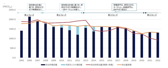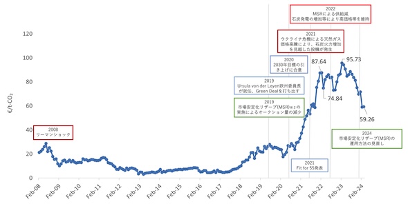 EU-ETSでは排出量実績の低減に伴い、長期に渡り排出枠(アローワンス)の取引価格が低迷していたが、2008年以降、排出量実績がETS指令が設定する排出上限を下回ったため、2013年に「Backloading:排出枠の市場への放出を一部保留・先送りする措置」を導入したほか、2019年には「Market Stability Reserve:排出枠オークションの一部を予め保持し、必要に応じて市場に放出する制度」を導入した。