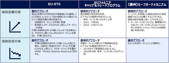 ETSは制度対象総排出量に着目した制度であり、需給バランスにより排出枠の価格が変動することは元々想定しているが、ETS排出枠の市場価格が急騰・急落すると、制度対象事業者の事業活動ひいては国民生活に多大な影響を与え得るため、多くのETSで市場安定化措置を設けている。市場安定化措置は大きく分けて「価格的アプローチ」と「量的アプローチ」があり、急騰・急落の双方に対応できるようにしている。
