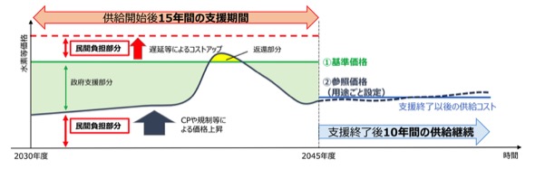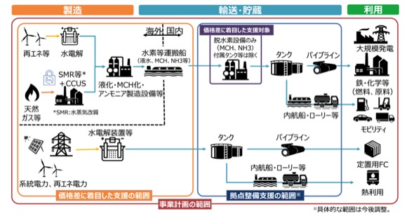 なお、海外から水素をアンモニア(NH3)やメチルシクロヘキサン(MCH)といった形態で輸入する場合、国内で脱水素装置を利用することが想定されるため、例外的に脱水素装置の運転費も含め、価格差に着目した支援の対象とする(付属するタンクやパイプ等は除く)。