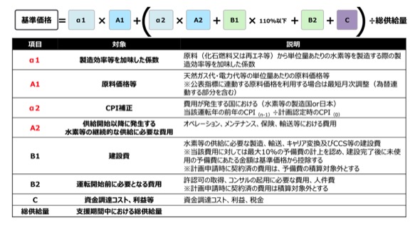 本制度の「基準価格」については、事業者がプロジェクトコストを回収できる水準として、基準価格(算定式)を提示する。本制度に申請する事業者の予見性を高めるため、物価・為替の変動や原料費等の変動は、算定式を用いて基準価格に反映可能とする一方、工事遅延によるコストオーバーラン等は基準価格に反映されない。
