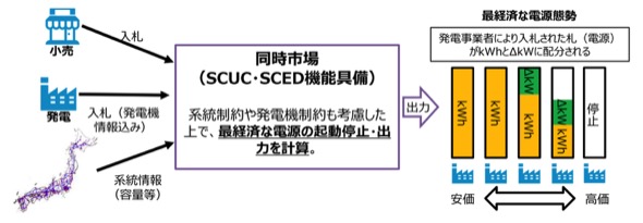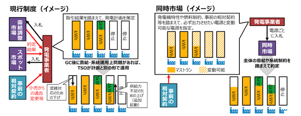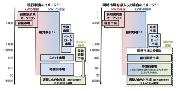 現在日本では、電力のkWh市場(スポット市場、時間前市場)とΔkW市場(需給調整市場)が分散している市場制度を運用しているが、市場価格の高騰や調整力の調達不足という課題を抱えている。今後の変動性再エネの更なる大量導入を見据え、これら課題に対処するため、kWh市場とΔkW市場を一体化した「同時市場」の導入が検討されている。