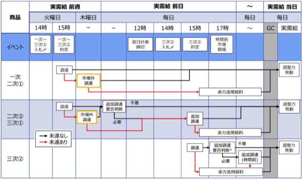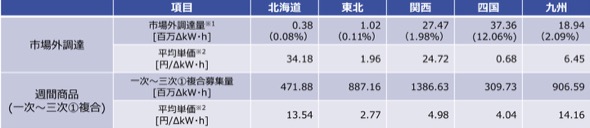 需給調整市場の商品のうち、週間商品(一次、二次①、二次②、三次①、複合商品)については、実需給の前週火曜日に開催される週間市場において取り引きされている。週間市場での取り引き後、調整力必要量に対してΔkWの調達が不調(未達)となった場合、一般送配電事業者はその2日後の木曜日に、市場外で相対契約により、追加で調整力調達を行うこととしており、これを「市場外調達」と呼んでいる。