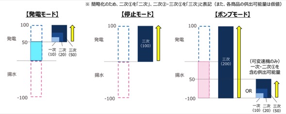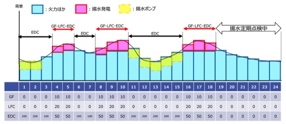 需給調整市場では、週間取引で一次〜三次①を、前日取引で三次②を調達しており、揚水発電機はこれらいずれの調整力も供出可能である。ただし、揚水発電機の各モード(発電・停止・ポンプ・定期点検中)において、供出可能な調整力の種類や量は異なる。