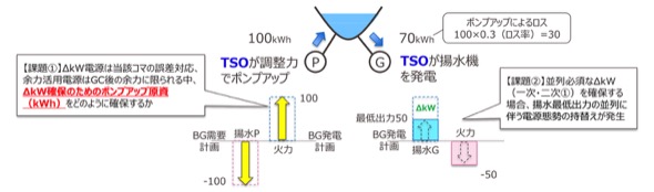 揚水発電機は蓄電リソースであるため、発電によるΔkW供出を行うためには、充電に相当するポンプアップを行う原資を調達する必要がある。