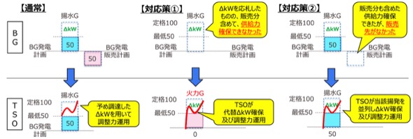 対応策1では、前日12時に作成した前日BG計画において供給力を確保できないと判断した調整力提供者(揚水発電)は、前日15時までにTSOに対してΔkW代替確保を要請通知する。これは、TSOによる余力活用電源を用いた調整力確保は、前日15時から開始されるためである。
