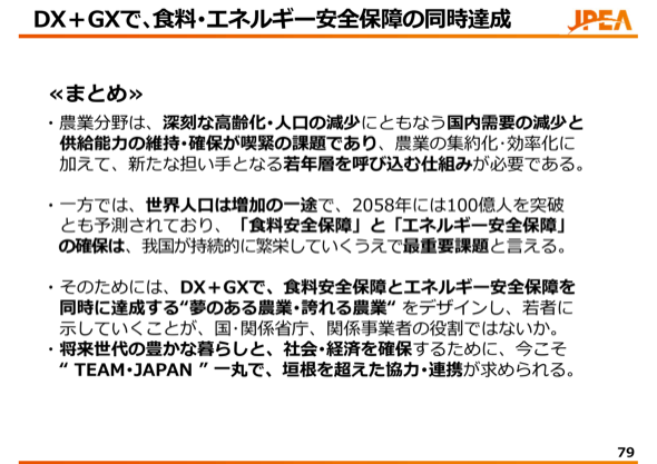 このセクションの最後には下記のようなまとめがありますが、「DX+GXで、食料安全保障とエネルギー安全保障を同時に達成する“夢のある農業・誇れる農業“をデザインし、若者に示していくことが、国・関係省庁、関係事業者の役割ではないか」とするのであれば、JPEAとして、国内の太陽光発電産業としての営農型太陽光発電や荒廃農地利用を通じて、農業・農村と向き合うポリシーやビジョンを同時に示すべきでしょう。