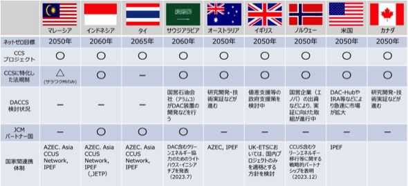 現在、パリ協定6条2項に基づく削減価値の国際移転の仕組みとして、日本は二国間クレジット制度(JCM)を運用しており、そのパートナー国は計29か国に上るが、DACCSの有望な豪州や米国・カナダなどは、パートナー国となっていない。よって、JCM制度によらない、パリ協定に基づく国家間移転の調整(相当調整)に向けた取り組みについても検討も進めていく予定としている。