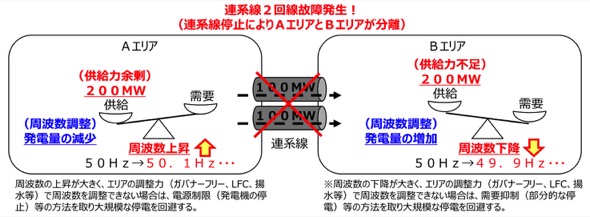 地域間連系線の周波数限度値は、連系線とその潮流方向により異なり、中西エリアでは低下側で59.0〜59.5Hz、上昇側で60.0〜60.6Hzで設定されており、限度値を超える場合、大量の発電機の解列や大規模停電に至るおそれもある。