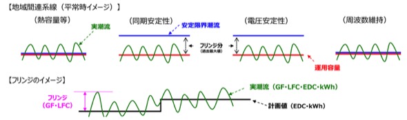 地域間連系線を流れる電力は、細かな需要変動や発電機制御の遅れ等により、連系線の指令(計画)と潮流の実績は完全には一致せず、瞬時的な差分(フリンジ)が生じる。