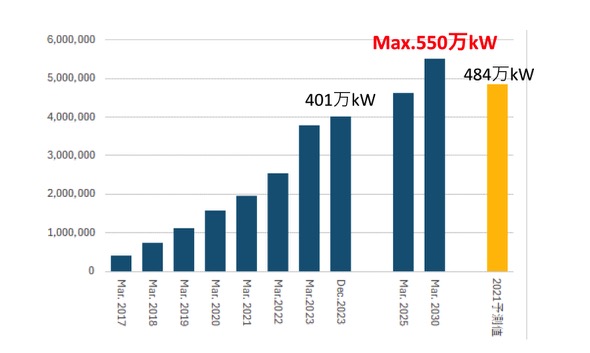 木質バイオマス及びメタン発酵バイオガス発電を含むバイオマス発電全体の導入状況は、エネルギーミックス2030年導入目標8.0GWに対して、2023年12月末時点の導入量は7.4GW、FIT/FIP認定済の未稼働量は3.4GWとなっている。このうち木質バイオマスについては、2030年時点導入量は5.5GW(550万kW)程度と見込まれており、家畜排泄物や下水汚泥等を原料とするメタン発酵バイオガス発電は、0.1GW程度と見込まれる。
