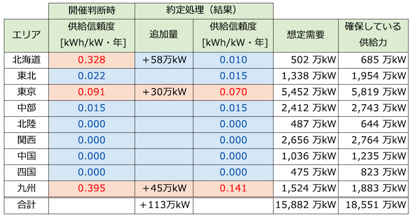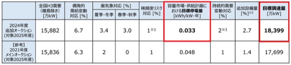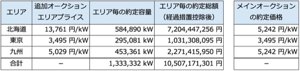 表3のように、北海道・東京・九州エリアでは、この目標停電量(供給信頼度)0.033kWh/kW・年を充足しておらず、相対的に停電リスクが高いと考えられるため、調達オークションが開催された。
