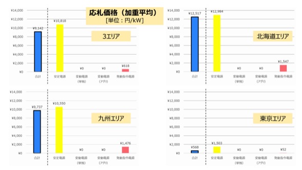 各エリアの応札価格の加重平均は、北海道エリア:12,517円/kW、東京エリア:568円/kW、九州エリア:9,737円/kWであった。2021年度メインオークション(実需給年度:2025年度)では、約定処理上の市場分断により「北海道」、「九州」、「北海道・九州以外」の3ブロックに分かれたが、その際の応札価格(加重平均)は、北海道エリア:4,870円/kW、九州エリア:4,061円/kWであり、追加オークション(調達オークション)では、応札価格が上昇していることが分かる。