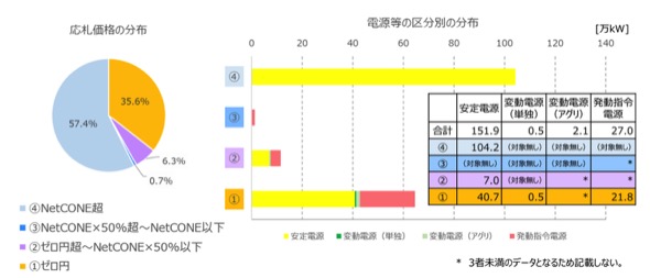 応札価格を、「①0円」「②〜Net CONEの50%以下」「③〜Net CONE以下」「④Net CONE超」、の4つの区分にした応札価格の分布は図5の通りである。メインオークションでは「①0円」が8割以上を占めたのに対して、追加オークションでは「④Net CONE超」が最多の57%であった。