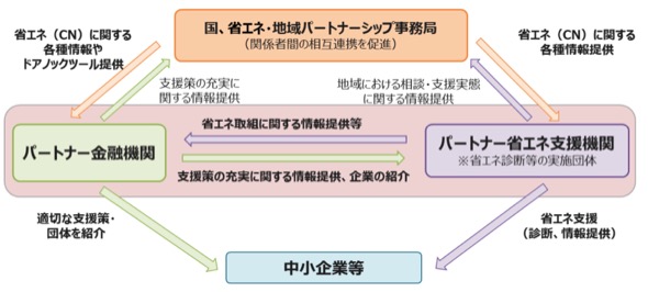 国は、省エネに関する政策情報や地域におけるベストプラクティスの共有等の各種情報提供等を行うことにより、パートナー機関による省エネ支援の活動を後押しする。本パートナーシップを通じ、各地域の関係者のネットワークが強化され、省エネ専門人材の裾野の拡大や中小企業等の省エネ促進、ひいては地域の省エネの取り組みが加速することが期待される。