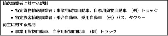 現在省エネ法では、輸送事業者・荷主に対する規制として、貨物及び旅客を事業として運送する自動車と、貨物を運送する自家用の自動車が制度対象となっている。