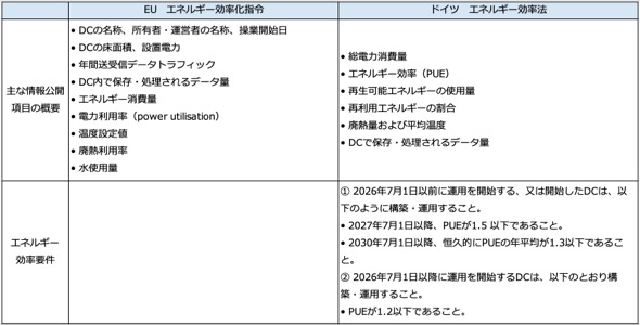 欧州委員会は、Energy Efficiency Directive(エネルギー効率化指令)に基づき、EU加盟国に対し、DCごとのエネルギー消費量等の情報公開の義務化を求めており、ドイツはこれらの情報公開に加え、DCのエネルギー効率に関する要件を設定している。