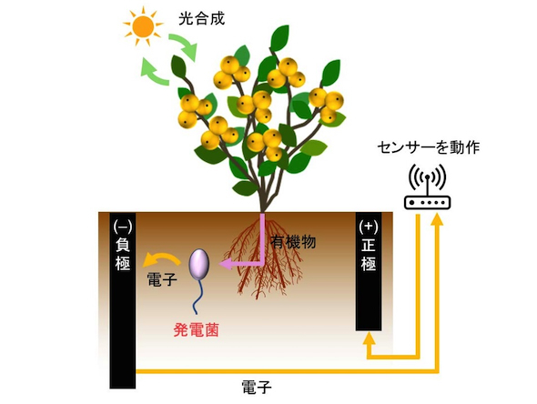 微生物燃料電池は発電菌と呼ばれる微生物の働きにより、有機物を分解処理すると同時に電力を生み出す仕組み。発電菌とは、有機物を分解する際に電子を放出する性質を持つ微生物の総称で、代表的なものとして、ジオバクター菌やシュワネラ菌がある。微生物燃料電池は、発電菌が放出した電子が土壌に差し込んだ負極に集められ、接続されたセンサーなどを通じて正極に移動する際に電流が流れる仕組みだ。