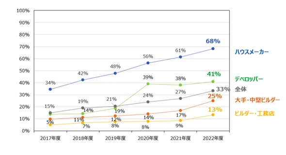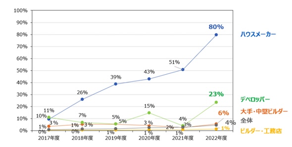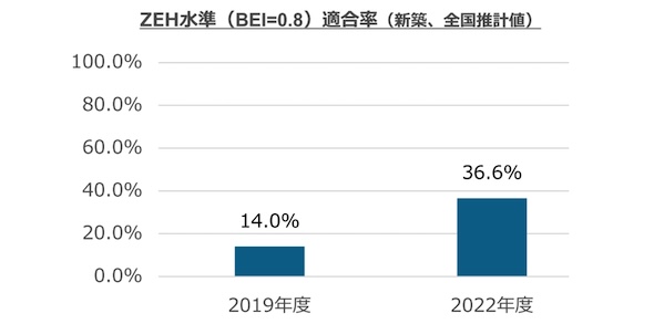 建築物省エネ法の改正により、2025年4月以降に着工する原則すべての住宅は、「省エネ基準」への適合が義務化される。また国はこの省エネ基準を、遅くとも2030年度までに現行の「ZEH水準」へと引き上げる予定としているが、現時点の適合率は36.6%に留まっている。