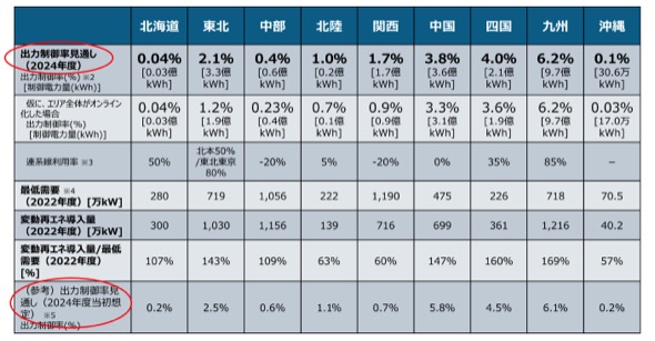 2024年度の再エネ出力制御見通しは、前回(2024年3月)の試算と比べると、日射量の減少や再エネ電源導入量の鈍化により、再エネ発電量が減少したことにより、複数のエリアで出力制御率も低下する見通しとなっている。関西では原子力の点検工程変更等により、当初想定より増加する見込みである。