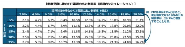 今回の見直しにより、FIP電源は出力制御の頻度が低下することが見込まれる一方、FIT電源は出力制御の頻度が増加すると見込まれる。系統WG事務局によるFIT電源の出力制御率の試算結果は表5の通りである。表5の最右列では、FIP比率が25%に増えると、現行制度では20.0%の出力制御率が26.7%へ増加することを示している。