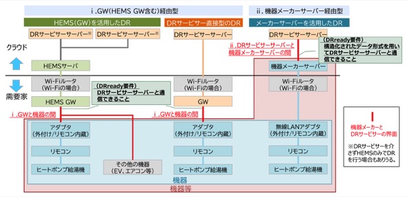 まず通信接続機能のうち、機器(HP給湯器)の接続対象としては、「ゲートウェイ(GW)」と「DRサービサーサーバー」のいずれに対しても接続可能とすることを求める。またデータ形式については、機器とGW間の通信では、ECHONET Lite等のほとんどの標準プロトコルではバイナリ形式を用いていることから、構造化されたデータ形式は求めない。他方、機器メーカーサーバーとDRサービサーサーバー間の通信については、構造化されたデータ形式(XMLやJSON等)を求めることとする。