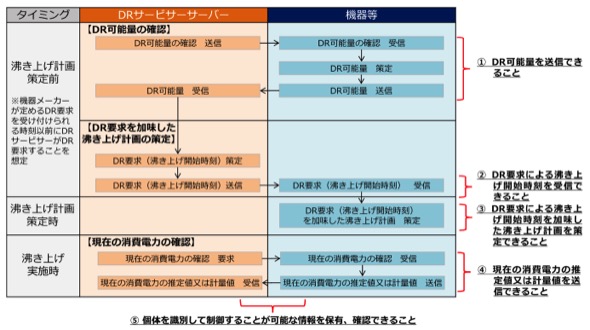また、DR要求を加味した沸き上げ計画の策定のため、「② DR要求による沸き上げ開始時刻を受信できること」「③ DR要求による沸き上げ開始時刻を加味した沸き上げ計画を策定できること」を要件とする。