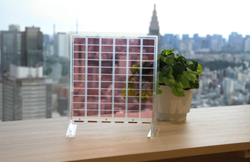 NTTアドバンステクノロジとinQsは、SQPVガラスのさらなる性能向上および品質改善に関する共同研究を進め、発電性能の大幅な向上に成功。30cm角のガラス1枚に対して1セルを搭載していた従来のSQPVガラスをマルチセル化(11×6セル)した他、材料も改良することで30cm角サイズ全体での出力値を向上させた。発電効率は1%で、発電性能は50mW以上(放射照度100W/m2)、可視光透過率は56%以上で、屋内での利用に対応する。