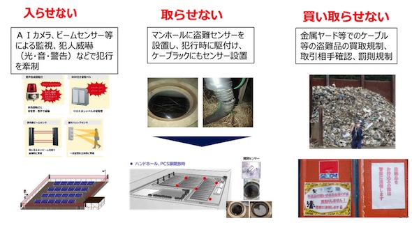 太陽光発電所のケーブル盗難対策としては、「入らせない」「取らせない(盗ませない)」「買い取らせない」の3つが重要であると考えられている。「入らせない」「取らせない」については発電事業者や保守点検事業者による対策が中心となるが、これだけでは盗難を完全に防ぐことは困難と考えられる。
