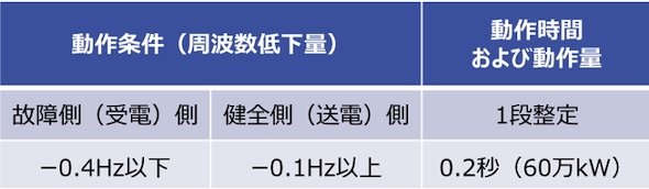 このため、FCのEPPS動作条件としては、故障側(受電)側では「−0.4Hz以下」であると同時に、健全側(送電)側では「−0.1Hz以上」が周波数低下量として定められている。