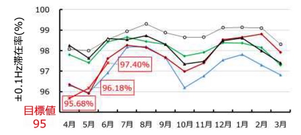 ところが近年、中西エリア(中部・北陸・関西・中国・四国・九州)では、変動性再エネ電源の増加や火力等の調整電源源の減少に伴い、周波数品質、具体的には標準周波数60Hz±0.1Hz以内滞在率の悪化傾向が生じている。(※「中部・西日本で電力の周波数品質が低下、その要因分析と今後の対策」を参照)