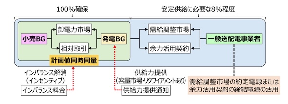 現在、小売電気事業者(小売BG)や発電事業者(発電BG)は、計画値同時同量のもとでインバランスを回避するという市場メカニズムを基本としつつ、一般送配電事業者は供給力・調整力を確保することにより、電力の需給バランスを維持している。