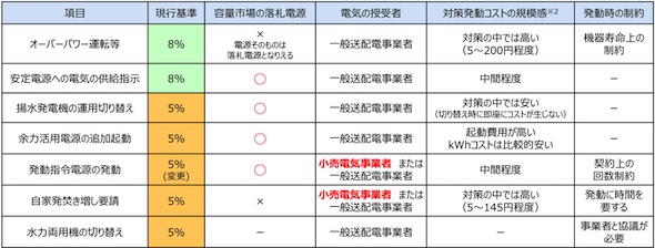 表1では、火力発電の「増出力運転(過負荷運転)」や「ピークモード運転」を「オーバーパワー運転等」と総称しており、いずれも設備に過大な負荷を与えるものであるため、発動には一定の制約を考慮すべき対策とされている。