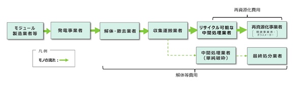 太陽光発電の終了後、太陽光パネルを再資源化するには、図5のように狭義の「再資源化費用」のほかに、「解体等費用」が発生する。