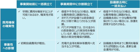ただし、発電事業開始から設備撤去までのどの時点で解体等費用を確保するかについては、「事業開始前に一括積立て」、「事業期間中に分割積立て」、「設備撤去時に一括支払い」の3つの案をベースに、費用確保の確実性や事業採算性への影響等の比較検討を行っている。