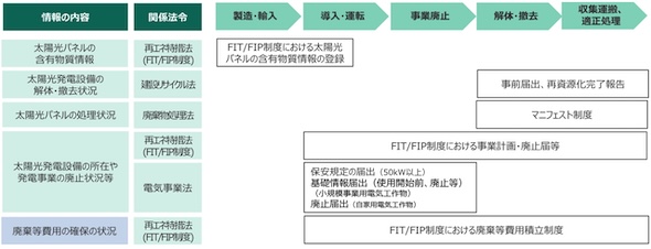 国は今後、非FIT/FIP設備も含め、太陽光発電設備に関する情報(所在や発電事業の廃止情報等)と廃棄・リサイクルに関する情報を紐付けて管理することが可能な、統合的な情報プラットフォームの整備に向けた検討を進める予定としている。