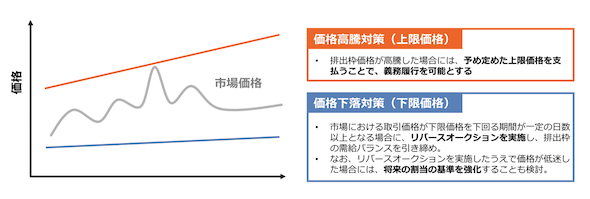 排出枠が不足した場合は、あらかじめ定めた価格(上限価格)を支払うことによる義務履行を可能として、ETS義務順守コストの高騰を回避する。また市場価格が下限を下回る場合、排出枠の「リバースオークション」を実施することで需給バランスを機動的に調整する。具体的には、GX推進機構が市場から余剰排出枠を買い上げる案が示されている。