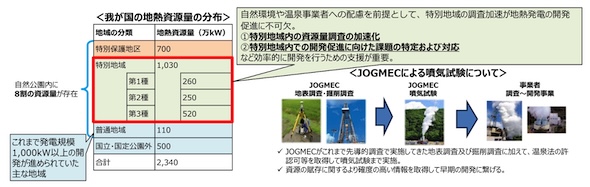 地熱発電の開発のためには、事前の地熱資源量調査が不可欠であるが、自然公園法に基づく「特別地域」の調査は、民間企業では情報・アクセス・社会環境等の面からリスクが大きく、参入が困難であった。