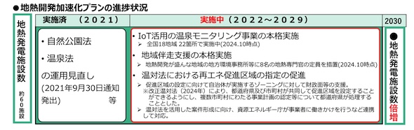 環境省は2021年4月に「地熱開発加速化プラン」を策定し、従来10年以上であった地熱発電開発リードタイムを2年程度短縮することや、全国の地熱発電施設数を当時の約60施設から、2030年までに倍増させることを目標としてきた。