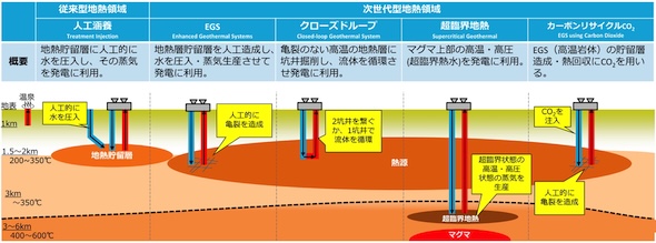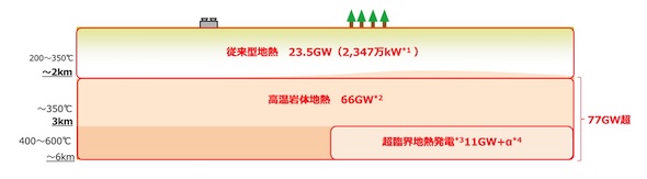 従来型地熱発電23.5GWの国内開発ポテンシャルに加え、次世代型地熱では77GW以上のポテンシャルが期待されており、国内外でさまざまなタイプの技術開発が進められている。