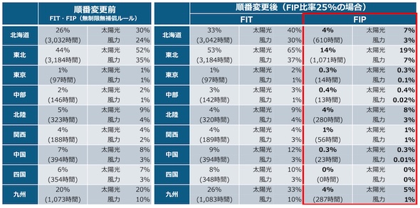 北海道や東北エリアなどでは、FIT電源とFIP電源の出力制御率の違いは非常に大きく、早期のFIP移行が期待される。