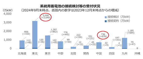 再エネ出力制御の低減や、調整力提供が期待される系統用蓄電池であるが、2024年9月末時点において連系済みが約10万kWに対して、接続検討は約8,800万kW、接続契約は約620万kWと、その受付量が急増している。