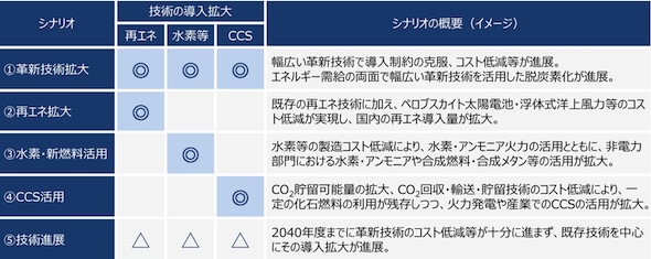 このため資源エネルギー庁では、2040年度のエネルギー供給を左右する技術として、再エネ、水素等の脱炭素燃料、CCSに着目して5つのシナリオを設定することとした。