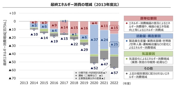 2022年度の最終エネルギー消費量は2013年度比で5,700万kL減少したが、この内訳としては、省エネ対策導入効果を含む原単位要因が1,500万kLであるのに対して、製造業生産量減少などの活動量・構造要因が2,500万kLと最大であることが報告されている。