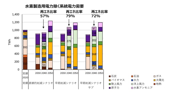 IGESの「早期削減シナリオ」では、2040年時点で再エネ及び蓄電池、水電解装置(水素製造)の導入が大きく進むと想定し、2040年の再エネ比率(系統電力需要ベース)は72〜79%に達すると推計している。