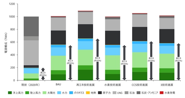 デロイトトーマツコンサルティングでは、エネルギーモデル「TIMES」を活用し、地理データに基づく再エネ導入可能量や電力系統情報等を入力することにより、シナリオ別エネルギーミックスを分析している。同社の想定シナリオは以下のとおりである。