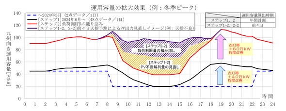 九州電力送配電では「ステップ2」として、この「59.1Hz負荷側UFR」を活用し、負荷制限量として織り込むことにより、点灯帯を中心に10〜60万kW程度の運用容量が拡大可能と考えている(図9の赤線)。