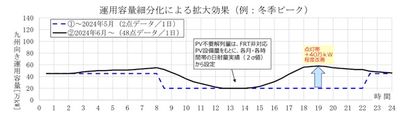従来、九州向きのスポット取引市場分断はほぼ発生しなかったことから、運用容量は実運用で2点データ(48コマの昼間帯・夜間帯の最小値)を使用していた(図8の青色破線)。
